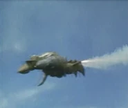 Airdolmen was quickly overpowered by Jumborg 9's sheer strength which irritated Mad Go-Ne. The robot monster attempted to get away and managed to fly off once Jumborg 9 threw it into the air. Naoki tried to pursue it only to realize Jumborg 9 was unable to fly, causing Mad Go-Ne to laugh and have Airdolmen drop carpet bombs on him from above.