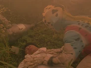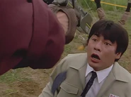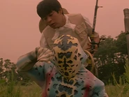 Hayate and Musashi escaped from Mogedon's body. Musashi explained to Dyna that the kaiju was only rampaging because Ndamoshite X was lodged in its throat. Hearing this, Dyna transported Mogedon into space.