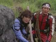 To remove Ndamoshite X, someone would have to enter Mogedon's body while it was asleep. Musashi volunteered for the task, but Hayate, not trusting Musashi, insisted on accompanying him. He warned that if Musashi made any suspicious moves, he would deal with him on the spot. Together, Hayate and Musashi entered Mogedon's body through its mouth. Meanwhile, the event was broadcast on television, and Musashi's wife and child arrived at the scene.