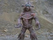 Alien Khan came to Earth in search of the mammalian Kaiju Orphy. Disguising himself as a human named Sakamoto, he led a group of hunters who hoped to anesthetize it. Upon find Orphy’s location, the hunters played music that drew the monster out of its hiding spot. he monster stripped a tree bare to use as a conducting baton and then pulled out a sheet music of Largo from his belly button, and acted as a conductor to the band. Alien Khan made the music go faster, resulting in the monster dancing around to the beat until he sprained his legs when he got to the village by his own free will. After being found out by ZAT, Alien Khan shed disguise and attacked the team and the surrounding area, causing rockslides and awakening the monster once again. The alien used his powers to aggravate the monster on purpose and destroy the area around him and he soon implanted himself inside the gentle giant's navel. The pain drove the monster mad and after ZAT's efforts were proven ineffective, it was up to Ultraman Taro to sooth the beast. Both giants engaged each other in close combat and were locked in a stalemate. After a short fight, Taro used a giant pair of tweezers to extract Khan out of the monster's bellybutton, and threw it away, destroying the cretin in the process.