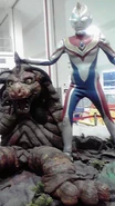 The next morning, Bao-on discovered another red balloon and started following it as it was leading him towards the city. Super GUTS then took the offensive and attacked Bao-on with laser and tranquilizers, but this only frightened Bao-on back into the village from before. Ultraman Dyna quickly arrived just as Bao-on was about to (unintentionally) crush the scientist, Mustafa, who was helping Super GUTS, Ultraman Dyna appeared and tried to hold off the monster by turning into Strong Type to lure him away from the village, but Bao-on's natural strength and Sleep Waves made him a difficult task for Dyna to stop him. Realizing Bao-on was not an aggressive monster, just a misplaced one, Dyna reverted into Flash Type and created an Ultra Balloon to distract Bao-on as he carried the monster back into space, where he wouldn't cause trouble for Earth again.