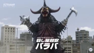 A wandering member of Yapool's Terrible-Monsters, Baraba launched an attack on Earth while his master was still inanimate, having not yet revived after his most recent defeat. After creating a portal to Earth, Baraba was confronted by STORAGE, but began focussing its attack entirely on Haruki Natsukawa, as he initially thought the host was Ultraman Ace because of the signals being given off by the Ace Medal. Haruki transformed into Z, but was beaten down by the Terrible-Monster and was nearly killed by Baraba after he prepared to execute him by bringing his sword down towards his chest.