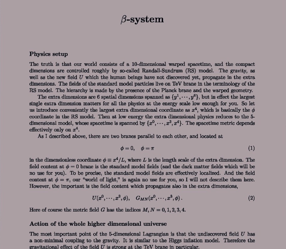 The Planck brane is the foundational concept upon which the Beta System operates. Without it, the technology is useless. The principle of the Planck brane and thus the Beta System is thus: the universe is composed of three spatial directions and one of time, but there is at least one more direction that can be traversed a Fifth dimension that is unnoticed by our human sciences, and by our scientific equipment. With there being three, in total, extra dimensions not visible to humanity, that the system utilizes.