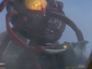 Knowing the girl was in grave danger, Gen rushed to the girl, trying to tell her the danger the shells were. Finally, Black Terrina descended on the town, knowing Leo had been wounded and the time was right, taking control of her slaves. Quickly, Leo ran to fight the monster and tossed her into a building. Preparing for battle,the monster opened out her saucer form and attacked, aiming for Leo's injured eye. Blinded, Leo was left at the monster's mercy, slammed and slashed to the ground repeatedly, even lifted to the air and dropped to the ground.