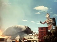 Ultraman Jack took over and confronted Eledortus. The Kaiju initially overpowered Jack with an energy beam from its tail and repelled his attacks with its electric body. As Jack's timer started blinking, he attempted a jumping attack but was blocked by the Kaiju withdrawing its head into its shell and was knocked down again by its tail beam. MAT provided a distraction, allowing Jack to use his Spacium Beam to destroy Eledortus, ultimately blowing it to pieces.Revenge of the Monster Lad