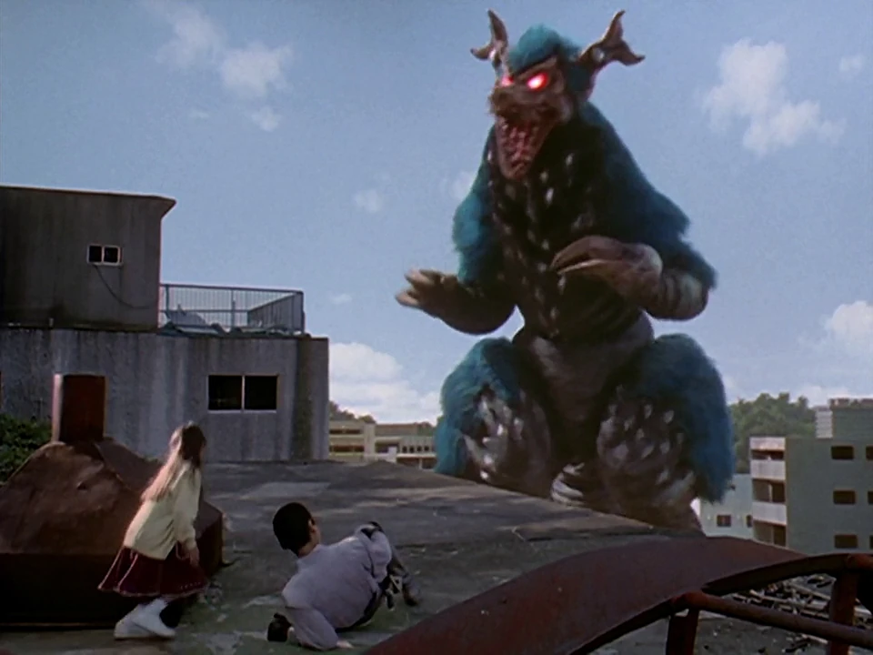 That next day, a young girl named Yuka finds the remaining baby Gyabish washed upon a beach. When approached by Ryo, who was visiting the orphanage along with Asuka, Yuka ran away with Gyabish into an empty room. Here, Yuka confesses to the infant kaiju of her loneliness and how her parents had died in a kaiju attack. At that moment, the Alien Dais had located the Gyabish and attempted to shoot it. Asuka and Ryo intervene in the nick of time and manage to knock the alien unconscious after what seemed to be hesitation to shoot at Yuka.