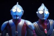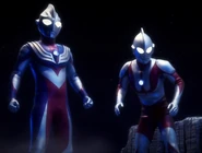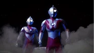 Tiga and Ultraman's time limits are almost up, and Chigusa and Kenta panic, not wanting to die in space. Ginga gets to them in time and returns them to Earth.
