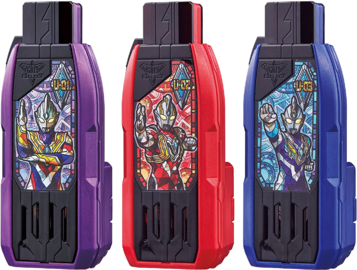 The GUTS Hyper Keys are the first series collectibles in the Ultraman Series to have individual electronics, and are able to interact with various other devices in the series such as the GUTS Sparklence and Circle Arms. In the toy releases, they can switch between the standard Hyper Key Mode and Sound Mode by holding down the button on the top left.