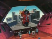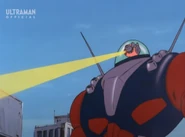 Appearing in Tokyo one day was the Heller aliens' giant robot monster Gedon. Once the Science Guard Party was on the scene Gedon used its superior fire power to gain the upper hand and even took down the Ultria. Once Choichiro turned into Ultraman Joneus, he assaulted the robot only for neither of them to over power the other even when the hero used the Planium Beam. Gedon returned to its control ship only to reappear at the Science Guard Party's base later that night. Before it could destroy the Ultria, Joneus attacked Gedon again and managed to easily out maneuver it. Shortly into the battle Joneus destroyed Gedon's control ship the killer robot violently malfunctioned. During this the Ultria unleashed a barrage from its cannons before Joneus finished Gedon with a a shot of the Planium Beam.