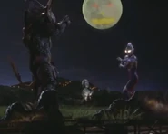 Meanwhile, Rena began sleepwalking from the witch's spell, but was stopped by her team mates. She revealed what had happened, giving the team the knowledge they needed to track down the Halloween demon as her lair entered this dimension to accept her new stock of food. However, before all the children could be taken, GUTS opened fire on the witch, breaking her spell. Undeterred, Gilanbo caused her lair to head back to her home universe. It seemed as if the evil witch would escape, but suddenly, her lair stopped sinking into its home dimension. Daigo had managed to escape the death trap and reclaim the Sparklence, transforming into the mighty Ultraman Tiga. As Tiga pulled her lair back from its dimension, the enraged Gilanbo transformed into her real self to take her revenge. The beast was a good hand-to-hand combatant, able to match the giant of light in combat as few had so far. However, the witch soon decided to pull out all of her tricks, using her teleportation to confuse the hero and attack from his blind spots. She then created an army of clones and assaulted the Earth's guardian from all directions. Soon, Tiga's timer began flashing red under the demon's assault, but the hero refused to give up and used his Timer Flash to disperse the copies. Now revealed, Gilanbo was beaten down and thrown high into the air where Tiga's Ultra Fix held her in place. Seconds later, Tiga used the Zeperion Beam to put an end to the Halloween nightmare once and for all. Upon her defeat an aurora appeared and the children regained the dreams that Gilanbo had taken from them. On Halloween Night