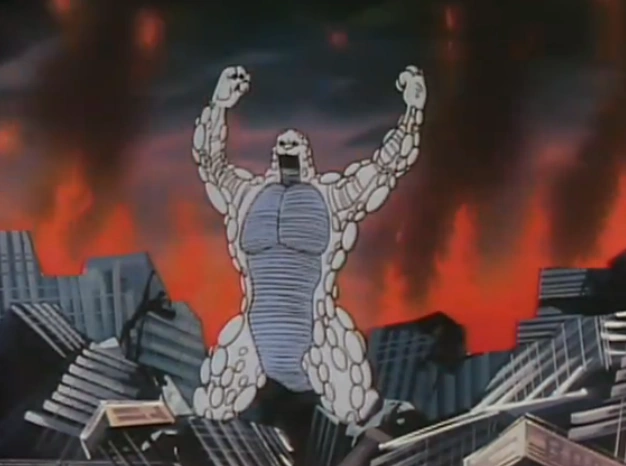 While the Heller Army attempted to bomb the Science Guard Party's base with android 201 squad, Golding was sent to destroy the city of Tokyo. Golding was able to cause massive amounts of wanton destruction before the Science Guard Party showed up in the Ultria. Golding was able to withstand the Ultria's cannons and soon countered with a whip of shards from its mouth. Within a few hits Golding managed to defeat Ultria before it was saved by Ultraman Joneus. Shortly after Joneus removed a bomb that was planted inside Pigu, he grew back to his normal size and proceeded to fight Golding. After the Planium Beam failed, Joneus used the bomb and threw it into Golding's mouth, causing the shard monster to explode.