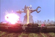 Sometime ago, the Alien Srayu decided that any planets that became a potential threat to them must be destroyed. With Earth as their target, they send Lamia, a representative of them to brought the planet annihiliating robot Guinje to Earth. Once arrived, the JADF forces attack Guinje, with the jet vanishes and drops a escape pod that contains an unconcious Lamia. While under the care of SRC, Lamia awakens a week later and escapes. When she tried to activated Guinje, a group of youngsters stole the key from her and ran away while unintentionally activating the robot killer. It emerges from a building after undergo a camouflage and transform from ship mode to robot mode. The robot was proven a challenge where it can withstand the assault from JADF forces and Ultraman Cosmos. Doctor Noboru returns the Guinje's key to her and orders the alien to deactivate the robot but only for his words to fell on deaf's ears. JADF forces approaches the girl as one of them accidentally fires a pistol but Dr. Noboru takes the blow from the pistol instead to defend Lamia. Witnessing the doctor's bravery of saving her, Lamia embraces and heals him, changing her view towards mankind and deactivated Guinje while departed away from Earth.