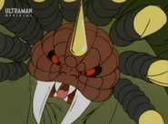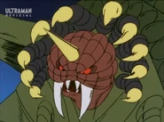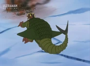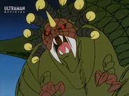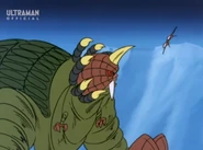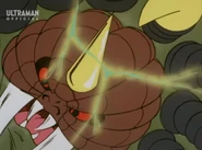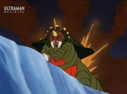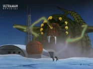 After taking over U40, the Heller army headed toward Earth to prevent Amia and Choichiro to find Ultria, a giant flying warship from U40 that laid beneath the Arctic ice. Once the Heller aliens attacked Japan they quickly unleashed their four-legged monster, Gumons, to attack what little the global defense force had in the Arctic. Gumons was quickly met by the Science Guard Party and shortly after Ultraman Joneus. Gumons proved more than a match for the hero as the beast used sheer force to overwhelm Joneus. Just as Gumons had Joneus pinned to the ground, Ultria rose from the ice and nabbed Amia with a tractor beam. As Joneus saw a tripe-barreled laser howitzer-like cannon being aimed in his direction with Amia in control, the hero kicked Gumons in front of the weapon. Upon the weapon firing Gumons was impaled by the lasers before erupting in an explosion.