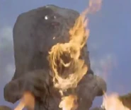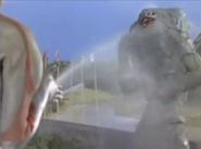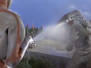 The next day, the army attacked Jamila with flamethrowers, but the mutant human was unaffected by them. Enraged, Jamila launched an attack on a nearby village to vent his rage, igniting it into a blazing inferno with his flames. The space giant soon approached the site of talks aimed at ending the Cold War at the World Peace Conference in Tokyo, only to be attacked with rain bombs that injured him.