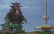 King Crab was a Terrible-Monster sent by Yapool who surfaced from the ocean and attacked an oil rig using its tail and its thick, bubbly foam. TAC soon arrived to fight the crab-like creature but to no avail. King Crab continued its rampage, introducing its fiery stream attack. Just as it began to seem that TAC was getting the advantage, King Crab disappeared and was transformed back into a horseshoe crab, where it eavesdropped on TAC’s plan to defeat the Terrible-Monster. So it reappeared again, this time in the middle of an amusement park, and resumed its rampage.