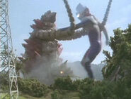 Once GUTS became aware of the monster's presence, Horii was quick to produce antidote to Litomalus's acid while the rest of GUTS managed to lure the monster away from the village he was in. When Litomalus found the kids that disturbed him, hiding inside of a GUTS vehicle, the beast tried to attack them, but was stopped by the lucky appearance of Ultraman Tiga. Once Tiga transformed into his Sky Type, Litomalus and the ultra were evenly matched in battle until Horii was able to finish the antidote, personally named "Horii's Special Antidote Missile", and fired it at the monster neutralizing his acid. With Litomalus now blue and powerless, Tiga was able to destroy him with the Ranbalt Light Bullet.