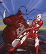 After Alien Baltan crashed his saucer into a mountain, Choichiro went to investigate thinking it was a strange meteor. However, he instead encountered Baltan's minion Mikonos as he dug his way out of the mountain. Choichiro turned into Ultraman Joneus and quickly engaged in battle with the monster after surviving a rock slide. Mikonos used brute force against Joneus, but was easily out maneuvered by the hero and his wrestling style attacks. Once the Science Guard Party arrived on the scene they witnessed Joneus executing a flying kick to Mikonos's head before he was finished off by the Planium Beam. While Mikonos lost to the hero it gave Baltan the opportunity to record Joneus turning back into Choichiro from afar.