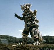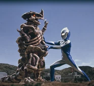 However, Mudon survived, and became enraged. She attempted to stomp on the workers, but Musashi turned into Ultraman Cosmos and saved them. Cosmos had the upper hand before Mudon stabbed her horn into the giant, causing him to bleed light. She then began to trounce the Ultra. But before she could continue, she was caught off guard by the sounds made by Team EYES. She then saw the cardboard cutout of her child, and, thinking it was real, called out to it.
