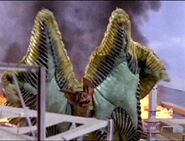 Pestar appeared on Suflan Island when Sevenger was active on it defending a research facility. After a battle ensued, with Pestar drinking the oil from Sevenger directly, Gandar appeared too. The three engaged in a free-for-all fight, but soon the two kaiju teamed up on the robot. The beasts fired their respective flame and ice attacks simultaneously, but the strategy backfired, as the two hit each other with the attacks, killing each other due to their weaknesses to the other's abilities. Sevenger Fight