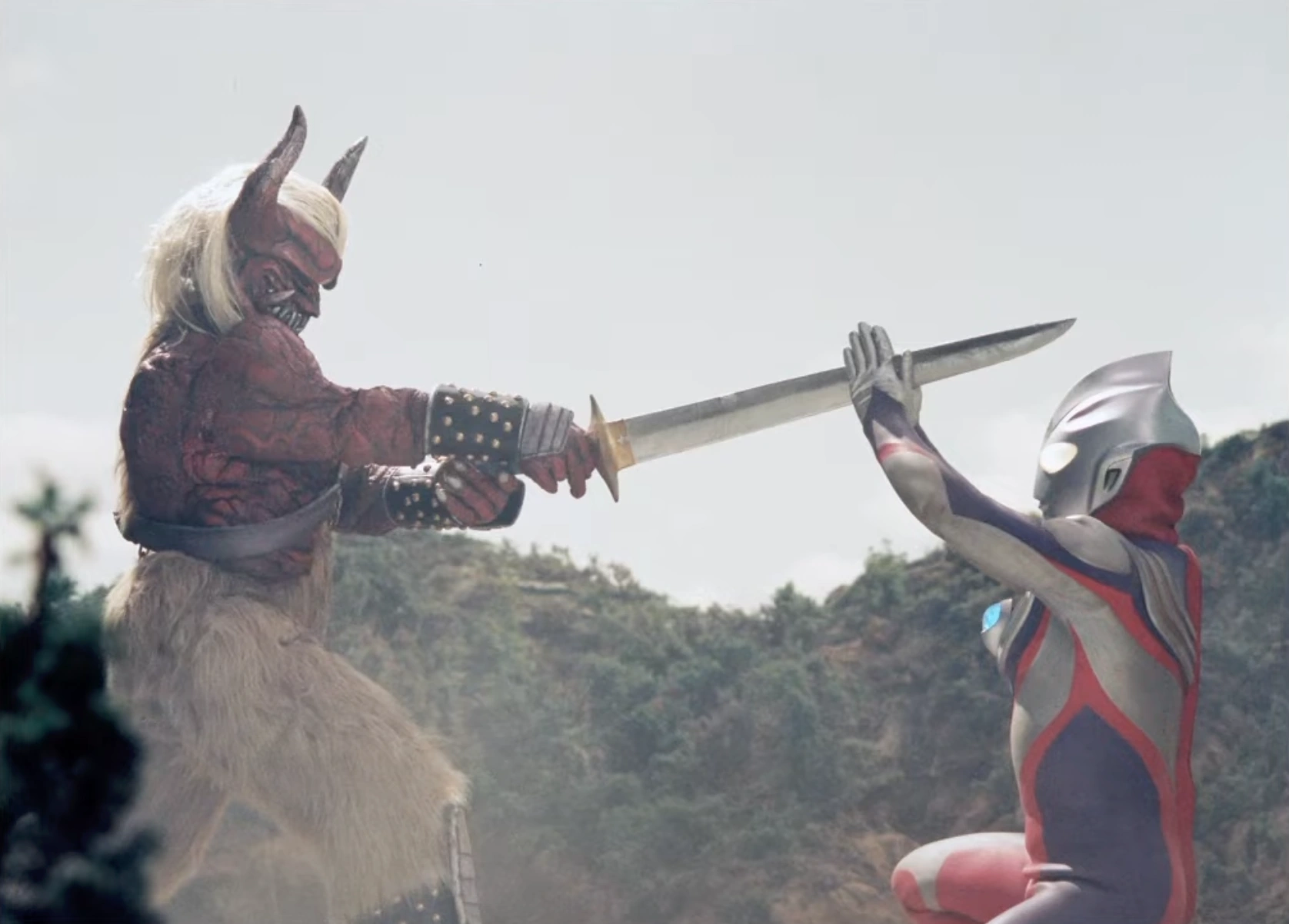 Daigo transforms into Tiga, and starts fighting the demon. Things seem evenly matched as GUTS helps Tiga fight, until Tiga grabs the demon from behind and is attacked by its second face. Sukunaoni reaches into the mountainside and takes out his sword. Eventually Tiga prevails and slices the demon's head off, only for the head to fly up and start biting him on the shoulder.