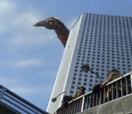 With the majority of his Saucer Monsters defeated by Leo, Black Directive was running out of his pets to send after the Ultra Warrior, having only three remaining. Satan Mora, a birdlike kaiju, was his next of his vile behemoths to be called into the war with Earth. While the terrible bird made its way to Earth, Black continued watching Gen, discovering he'd soon be in one of the city's skyscrapers, the insidious alien concocted a plan to use his latest creature. Satan Mora soon reached Earth and was picked up on radar, an onslaught of missiles were launched upon the terrible bird but the beast paid no heed, advancing single minded towards the target its master had sent it to destroy. A squad of jets was deployed to do recon and launched an attack on the beast, but this failed to do anything ether. The monster soon descended on Tokyo, releasing its miniature copies on the people below, causing mass chaos. Finally, the monster attacked a skyscraper, the same one that Gen had been in earlier in the day. The creature attacked curiously, attempting to topple the structure, threatening to kill those inside it.