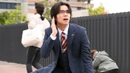 In the factory, Yuma was attacked by Oo-Ze, putting him in danger. Shu disregarded the danger and rescued him, but was knocked unconscious and buried under debris. In that critical moment, a "mysterious giant" appeared and transported Shu to safety. Upon waking up, Shu used his phone to record the entire battle between the mysterious giant and Shagong.