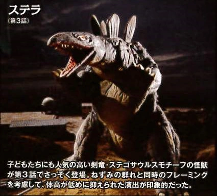 Stella is a Stegosaurus that first appeared episode 3 of Dinosaur Great War Izenborg. Stella is a common foe to both the super ship and humanity.