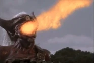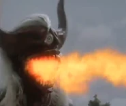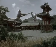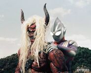 The oni's body dissolved into flames but the monster's head suddenly launched from the ground and sank his teeth into Tiga's shoulder, biting so hard that Tiga's Color Timer started blinking and he couldn't remove the demon. But as Sukunaoni's victory seemed at hand, his ancient enemy, the samurai, sent his katana flying through the air and into the oni’s head. Sukunaoni bellowed in pain as the holy energies contained in the blade surged through his head, obliterating the demon and ending his reign of terror once and for all. Following the fight, the samurai could finally rest in peace, granting his title as guardian of Japan to Ultraman Tiga.