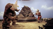 Fuji suggested making the "Dandara Grass Bomb" (ダンダラげし弹, Dandara Geshi Dan). Gomora had once consumed the essence of Dandara grass, which put it into a deep sleep for millions of years. The plan was to create bombs containing this essence and drop them to weaken Gomora. Meanwhile, Gomora smashed the stone walls of Osaka Castle, whose massive stones were originally transported by boat under Katō Kiyomasa.[1]
