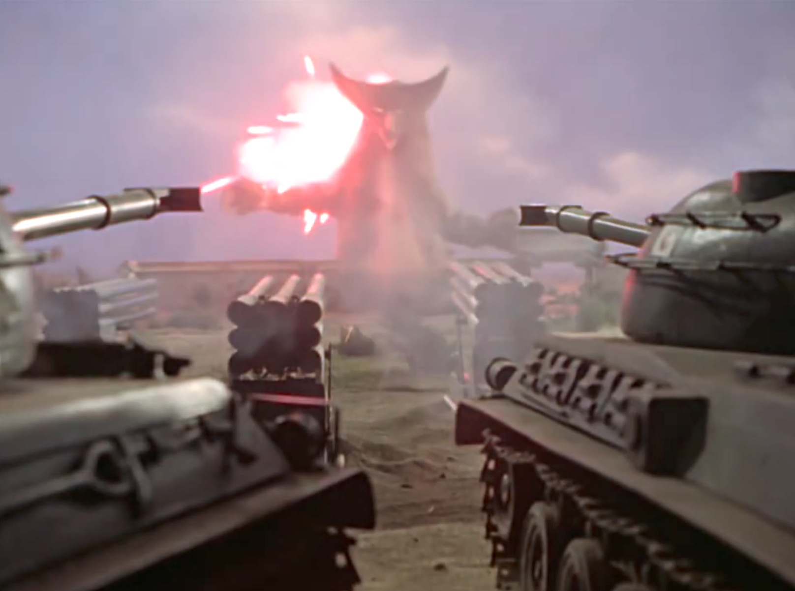 Originally, a comedic scene showed a rocket fired from a Jet VTOL hitting Gomora's rear, which it then threw back, accidentally striking a patrol car and sending it flying. This was changed in later drafts to the rocket hitting the JSDF's Mazer Tank instead.[1]