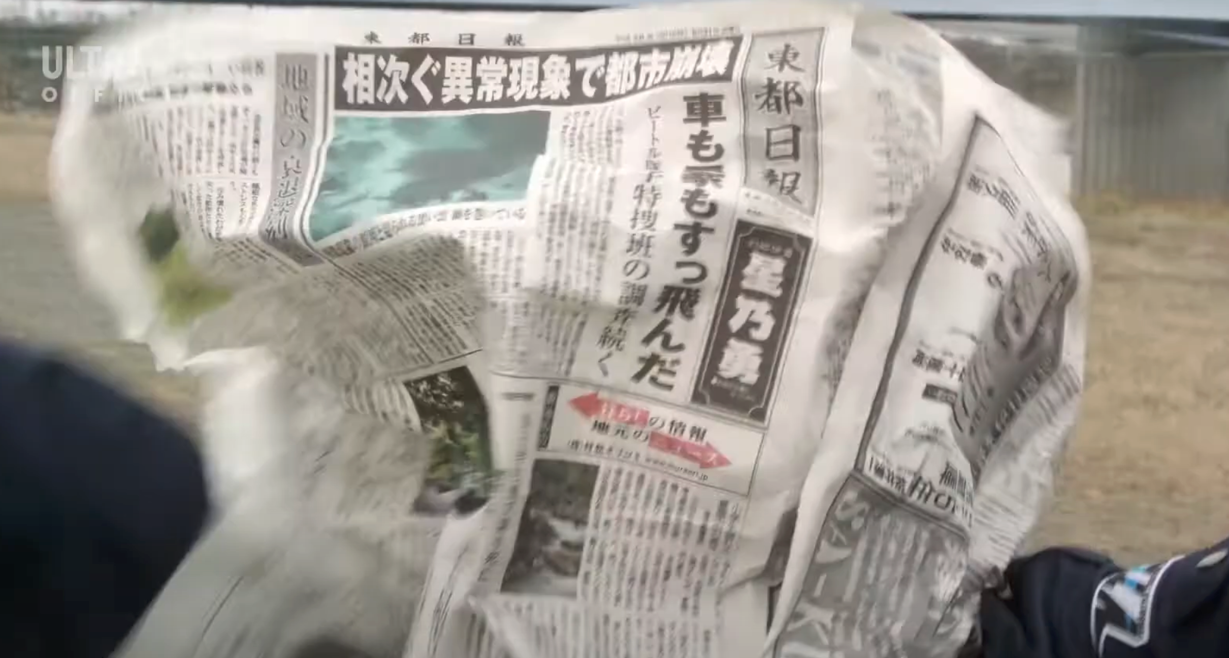 On the newspaper that is blown into Ittestu's face, there is a headline that reads: "Both Cars and Buildings got Chopped Off" referencing episode 14 of Ultraman Taro "Taro's Head Got Chopped Off!".