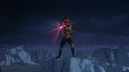A devastatingly powerful android Ultraman created by Lady-Benzene and programmed with a massive amount of martial arts knowledge, Ultraman Shadow's first mission was to attack Zearth in Antarctica. The war machine followed his target through the area at high speeds, finally landing to confront each other in the icy wasteland. Shadow soon gained the upper hand on the hero, smashing him to the ground repeatedly, kicking him into the air as he attempted the Spachouchoura Beam. The two fought high in the air, Shadow once again overwhelming the hero and using a diving kick to smash him into the ground below. Shadow launched a Shadow Fist Punch, striking Zearth's eye and giving it a blood red hue. Finally, the two set loose their signature beams, the colliding energies fighting but Shadow's overwhelming Zearth's and smashing him to the ground hard. Content with this, Shadow flew off, leaving Zearth laying unconscious on the ground, Color Timer blinking rapidly.