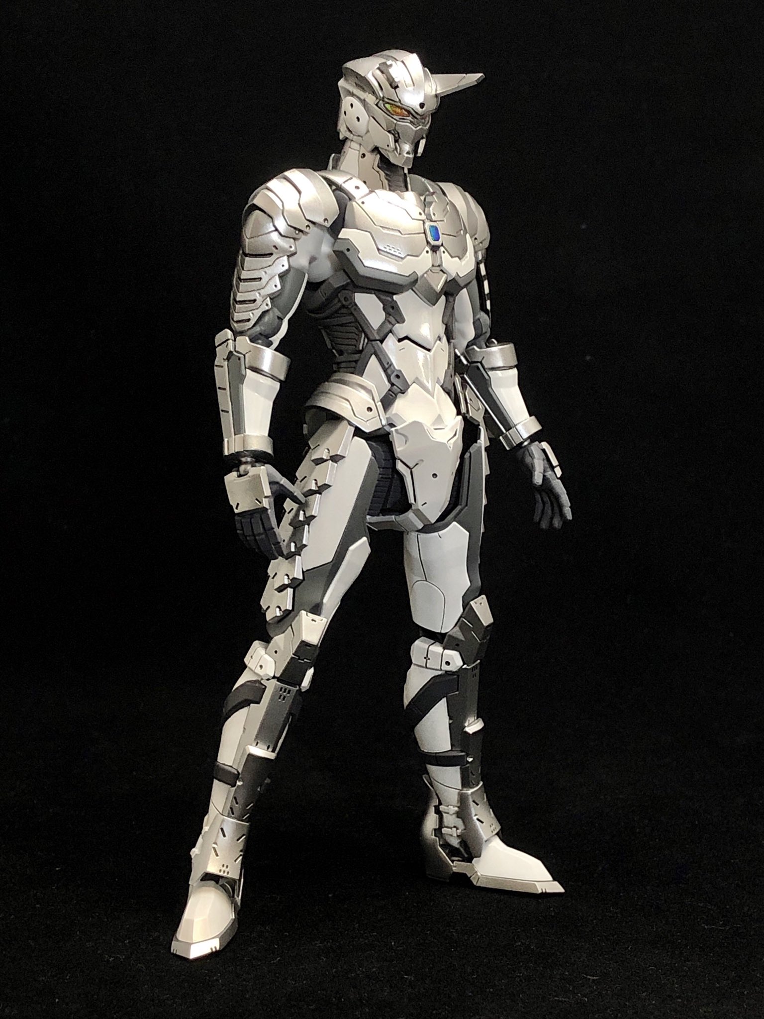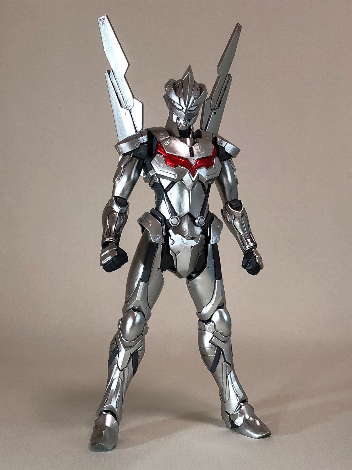 This Ultraman Suit design is the winner of the Takaya Aoyagi award of the first Ultraman Suit Plamodel contest.[108] It's design was created by painting the Figure Rise-Standard Ultraman Suit Zero kit as well as creating an custom back armor addition.