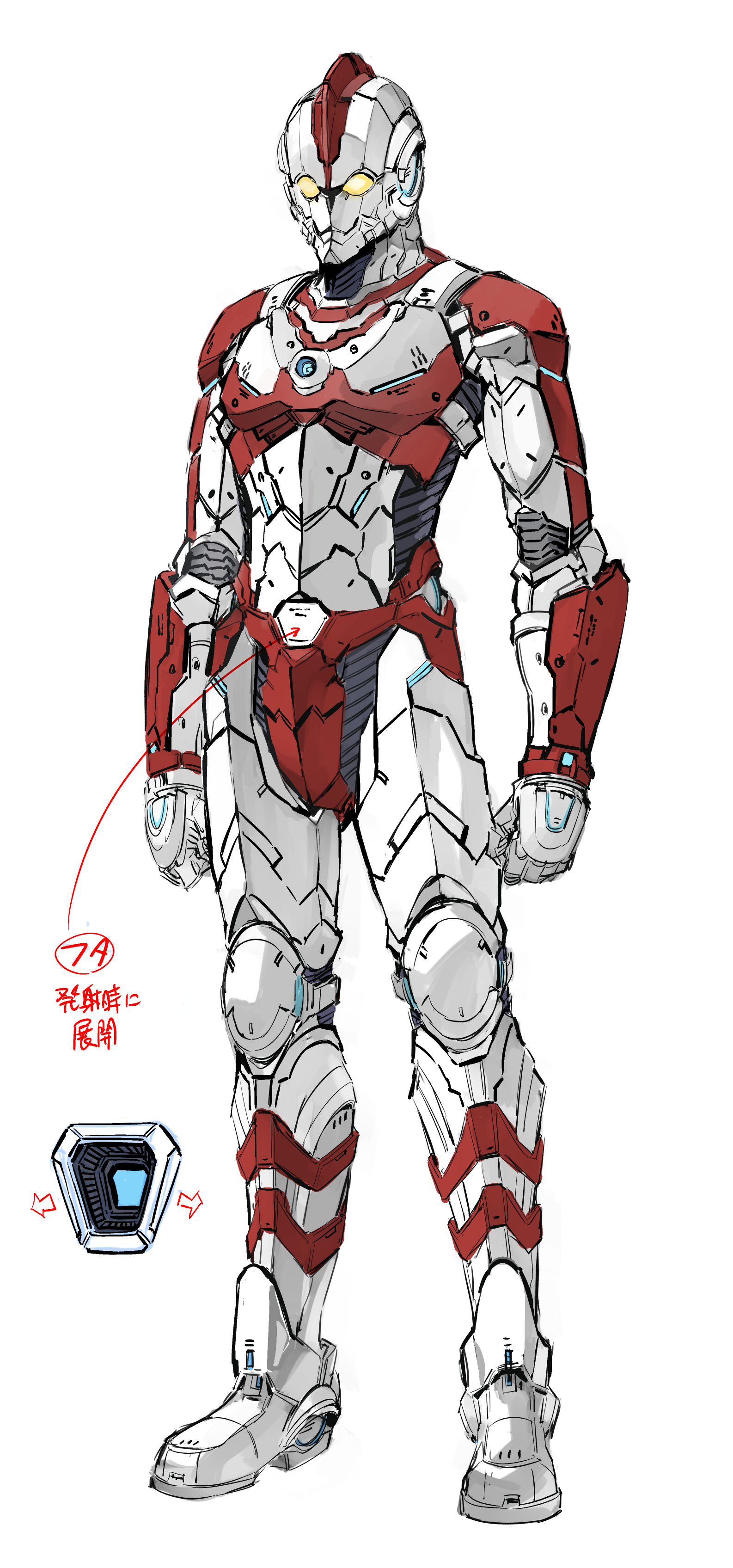 - Spacium Core: On the suit, there is a mechanical Spacium Core. When the suit's energy output or consumption of Spacium energy from the user drops below certain levels the light turns red and begins to flash like a Color Timer.