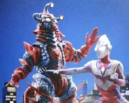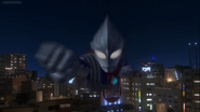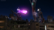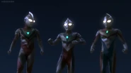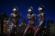 However, the mysterious cloaked being and many other similar looking beings use their magic to revive the souls of the defeated monsters. The souls combine to form Giga Khimaira. The monster knocks down the three Ultras, however, their friends and the city continuously cheer them on and they rise up to right Giga Khimaira. Soon, Hayata, Dan, Go, and Seiji transform into the Ultra Brothers with the help of their wives. Together, they free Ultraman Mebius from his imprisonment. The five then join Tiga, Dyna, and Gaia help fight Giga Khimaira. After repelling several attacks from Giga Khimaira, it flees into space. The Superior 8 Ultra Brothers follow it and finish it off. However after returning to Earth, the cloaked beings once again rise.