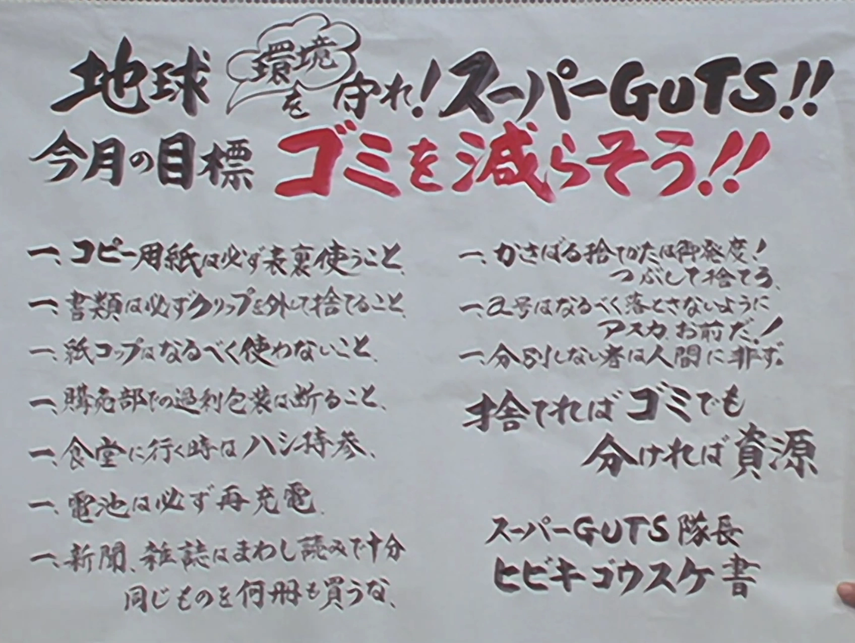 In the opening of the episode, the "Super GUTS・Reduce Waste Campaign" outlines ten rules, which include: